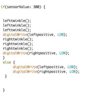 Para hacer las luces titilan, debe tener el leftpositive y rightpositive como bajo bajo su instrucción "if" y digitalWrite. El "otro" también se encuentra a la baja. Esto se muestra en la foto 2.