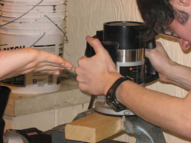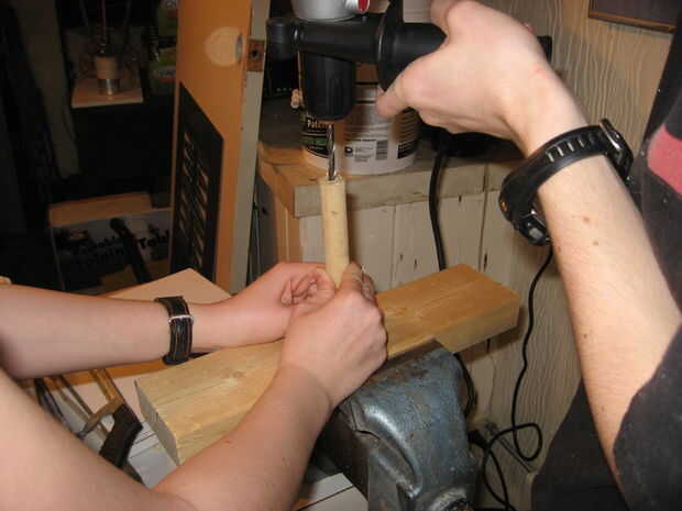 • Ruta de taladrar un agujero en la 2 x 4 para hacer espacio para el pasador de vuelta