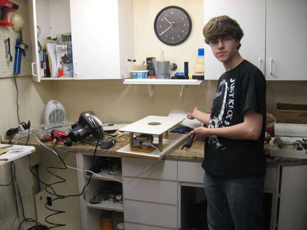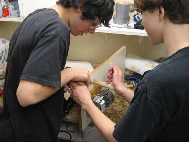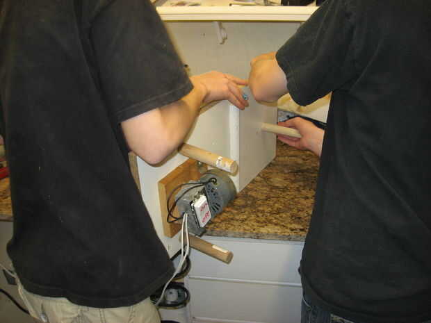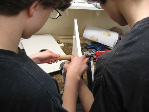 Use the NAILGUN! para clavar todo junto (puede utilizar un martillo y clavos si quieres...). Clavo el motor a la Junta, las otras piezas de espiga en lugar y ponen el 2 x 4 en lugar de modo que permite que el taquete gire libremente, pero de forma controlada. Si tienes algunos útiles del moldeado, puede ser útil mantener la 2 x 4 en el lugar. También puede clavar la supra-base en su lugar ahora.