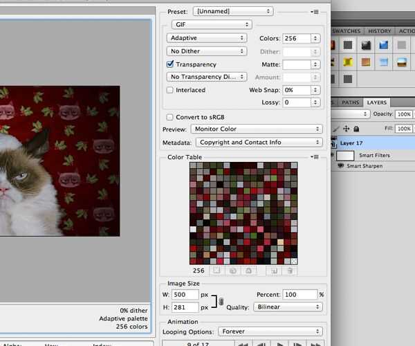 Ahora es el momento para guardar el gif. Al guardar el gif quiero ir a archivo > Guardar para Web y dispositivos. Desea entrar en la configuración en la segunda foto los mejores resultados.