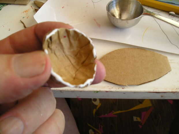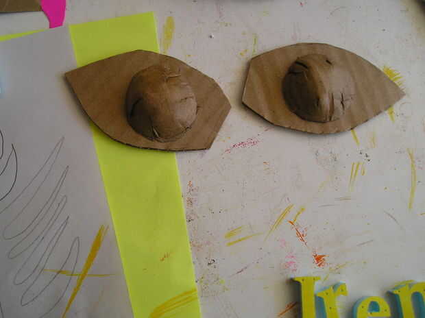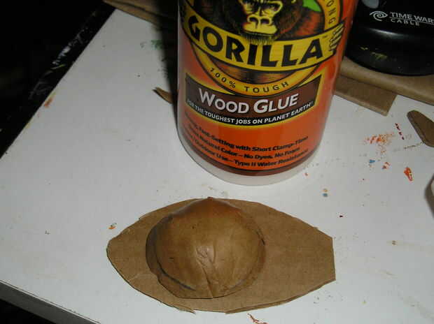 Ajuste del globo ocular que es plana en los bordes y puede caber la pieza de cartón forro... aplicar una pequeña cantidad de pegamento alrededor del borde como se muestra. A cabo contra el respaldo hasta que... un minuto o tan.