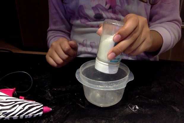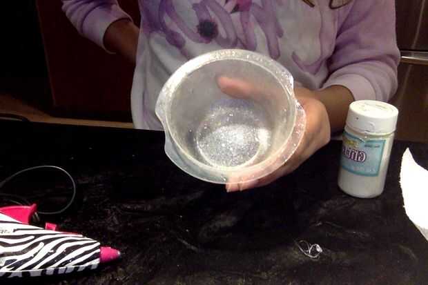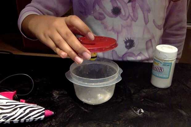 soy terapeuta infantil y esto es esencialmente una "botella tranquilo" (ver aquí) con un toque de Navidad.SuministrosTarro (yo escogí un frasco de plástico redondo de la tienda de dólar)Pegamento claro (o pegamento del brillo)Blanco y plata bril