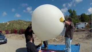Colocación y llenado el globo es una de las porciones más difíciles del proceso. Primero, las manos o piel no debe nunca tocar el balón ya que esto podría comprometer el látex. Guantes de látex o de nitrilo son una necesidad, como puede de tela que incluso lastimar la delicada membrana. La cantidad de helio a utilizar depende el globo particular y la altura deseada de la explosión. Esto se puede calcular de las aplicaciones y mesas en línea. En cuanto a la fijación, también esto debe realizarse con el máximo cuidado. La corbata alrededor del cuello del balón debe ser ajustada para mantener el helio de escapar o peor aún, su globo escape. Varios nudos son una buena idea. Sin embargo, apriete excesivo puede dañar el globo y debe evitarse. El cable que viene del globo deberá fijarse que el lazo de tela en la parte superior del paracaídas. Esto mantener el paracaidas totalmente condensado en la subida, sino que le permiten abrir tan pronto en el globo estalla.