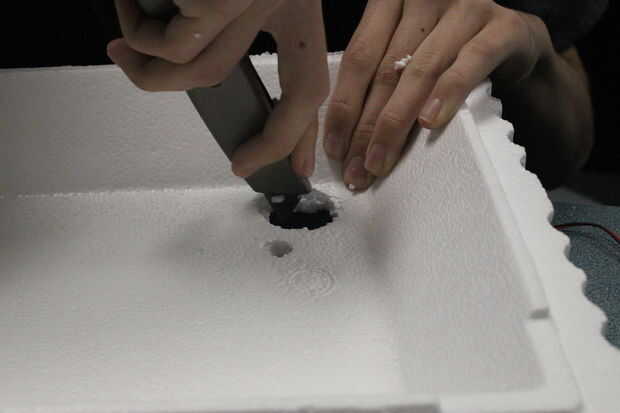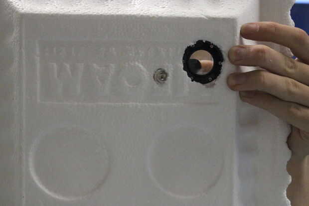 Montaje de la cámara es bastante simple. Nosotros Inicio presionando firmemente abajo ir Pro carcasa, dejando una impresión en la suave espuma de poliestireno. Desde aquí, utilizamos nuestra boxcutter para cortar alrededor de la impresión, dejando los agujeros para la lente y el botón de encendido. Luego, use cinta de doble cara para fijar el soporte de cámara para la espuma de poliestireno.