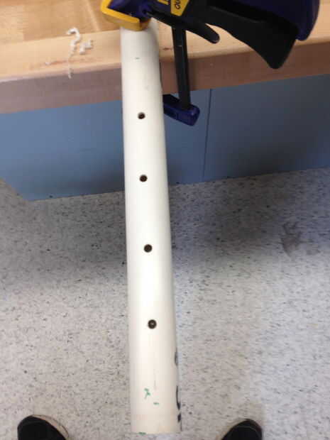 A) Perfore agujeros en cada pieza de PVC 2" aparte (puede ser más fácil perforar los agujeros cuando no todo está conectado)