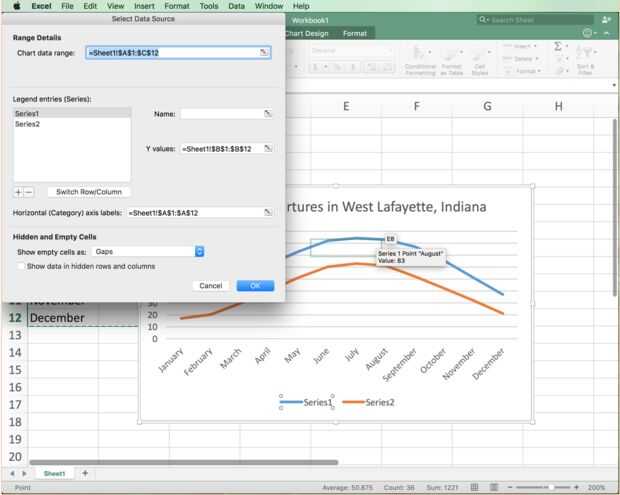 Ahora vamos a hacer una leyenda significativa que nos permitirá identificar lo que cada línea en el gráfico corresponde a. Cuando Excel se pone en una leyenda, es la primera columna como "serie 1" y la segunda columna como "Serie 2", como se aprecia en la parte inferior de la tabla. La primera columna contiene las temperaturas promedio, así que tenemos que sustituir "serie 1" con "Media alta". Para ello, haga clic en la leyenda. Haga clic en "Serie 1". Esto pondrá un cuadro alrededor de ella. Haga clic derecho en "serie 1" y haga clic en "Seleccionarlos datos". Se abrirá una nueva ventana.