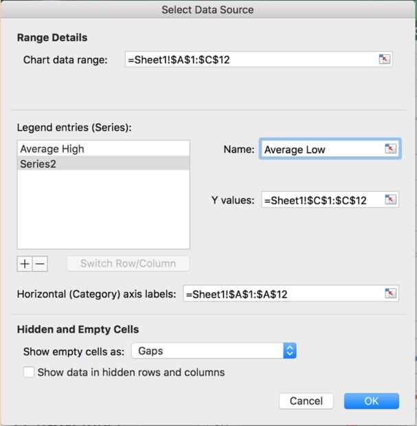 Como en el paso 11, escriba un nombre significativo. Como se explicó previamente, Excel coloca lo que entró en la segunda columna en serie 2. Puesto que lo que se entró en la segunda columna era las bajas temperaturas promedio, deberíamos nombrar esta "Media baja". Una vez que introducimos el nombre, haga clic en "OK" en la parte inferior de la ventana.