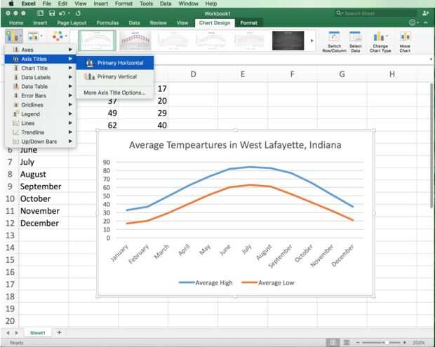 Ahora tenemos que etiquetar los ejes. Para ello, primero asegúrese de que está seleccionada la tabla. Vaya a la pestaña de "Diseño gráfico" en la parte superior de la programa. Haga clic en la miniatura de la izquierda que dice "Agregar tabla elementos." Ir a "Títulos de ejes", luego haga clic en principal Horizontal. Hacerlo otra vez pero en lugar de hacer clic en "Primaria Horizontal" haga clic en "Vertical primario." Esto va a crear cuadros de texto donde pueden ir los títulos de ejes.