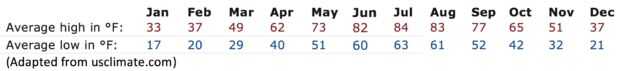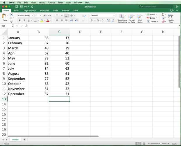 En la columna B, escriba en las temperaturas promedio para cada mes. En la columna C, escriba en las bajas temperaturas promedio para cada mes. La temperatura media para cada mes se puede encontrar en la tabla anterior.