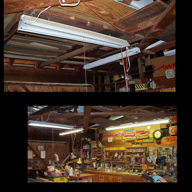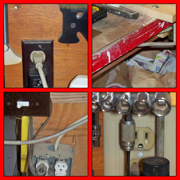 Cuando a partir de esta área de trabajo en el garaje, no planeo para circuitos eléctricos apropiados y las luces.  Sin embargo, con unos circuitos adicionales en y algunas soluciones imaginativas, suficiente poder y luces ahora están en lugar.