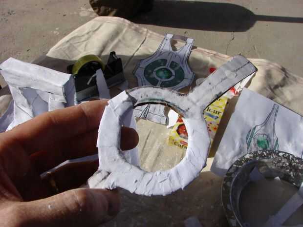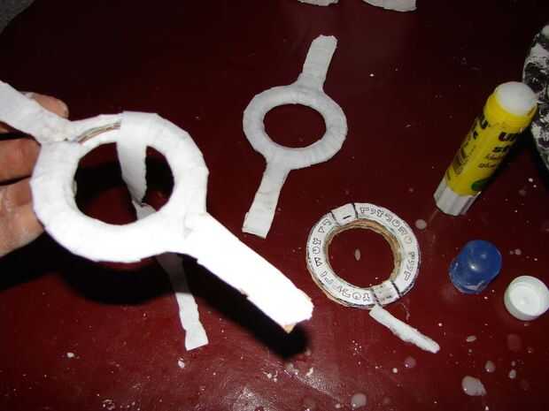 Cubre los marcos de la lente con papel maché, con el anillo adicional para facilitar la forma. Cubierta de marcos de lente de lado de manera similar, añadiendo la escritura Interlac al lado pegando en la impresión (parte superior de la guía en pdf en la página 10)