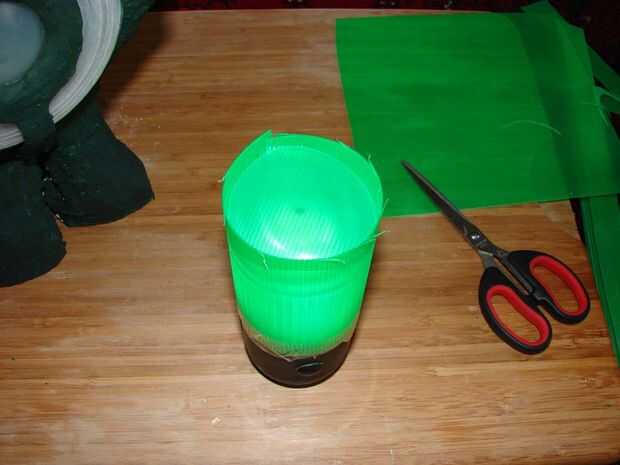Tomar algunos plástico verde (yo usé una carpeta de plástico verde) y Envuélvala alrededor de su lámpara de LED tamaño adecuadamente. Asegúrese de que la linterna puede ser insertada en la base de la batería de poder. Usted puede simplemente cinta la linterna en su lugar (que permite acceso para cambiar las baterías), cableado a un interruptor entre los LEDs y pilas de linterna. Coloque el interruptor en algún lugar accesible.