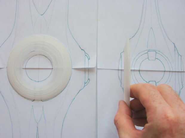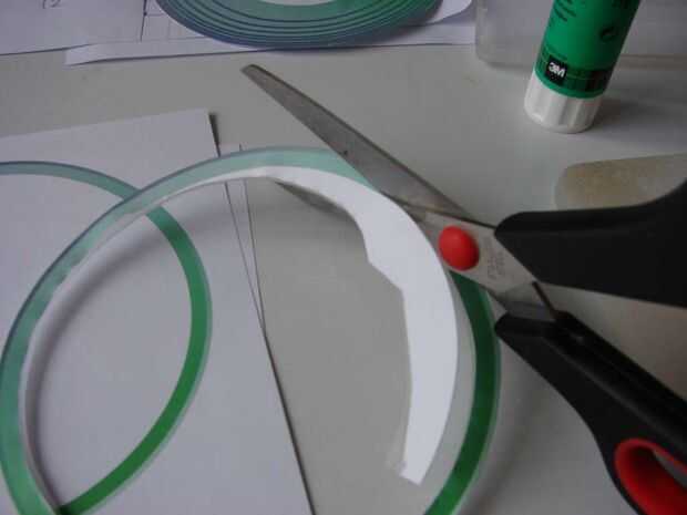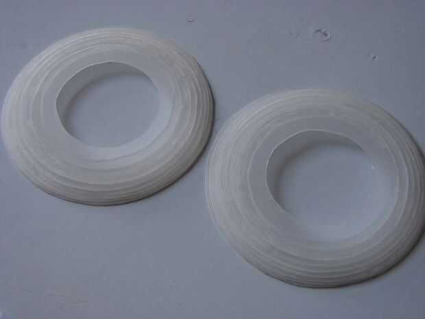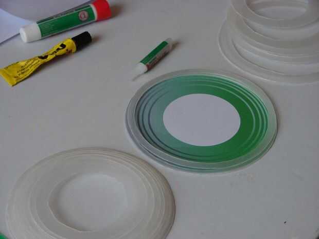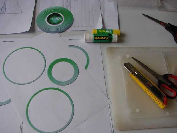 Imprimir las plantillas de la lente en las páginas 14-16 de la guía en pdf. Usando un palillo del pegamento, pegue cada anillo a base de plástico. Con tijeras, recortar cuidadosamente cada anillo. Retire la plantilla de papel, usando una lima para suavizar cualquier bordes ásperos. A partir del anillo más grande, pegamento y colocar el siguiente anillo más grande y así sucesivamente hasta alcanzar el anillo de centro. Puede utilizar una copia impresa de la guía en pdf en la página 13 para ayudar a la posición sus anillos correctamente. Necesitas dos lentes escalonadas, así que repita este paso para hacer una lente adicional.