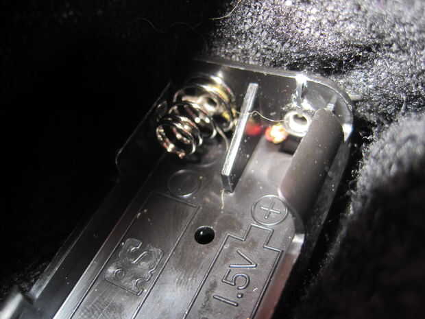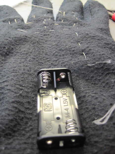 Tomar el hilo positivo y hacia coser a la base del guante donde se sentará el paquete de baterías. Fije la batería entre la capa interior y exterior del guante atando un nudo por el lazo conductor metálico. Tome otro trozo de hilo conductor y conecte al lado negativo de la batería de la misma manera. Empezar a coser la pieza "negativa" del hilo de rosca para arriba hacia el otro lado del guante, éste se convertirá en un lado del interruptor de presión.
