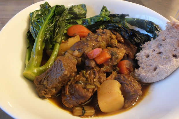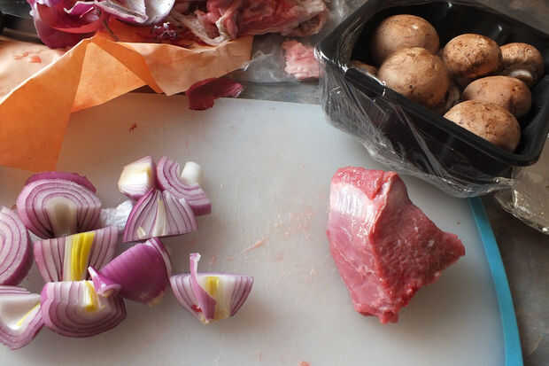 2 a 3 libras de carne de res o ternera Guisar carne, en trozos grandes (esto es magra y tiene tiempo para cocinar. Es sabroso y económico)