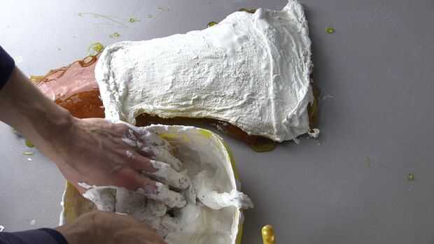 Empape una gasa en el yeso de París y coloque al menos 5 capas incluso el paño de queso empapada de yeso sobre el molde del caucho de ComposiMold.