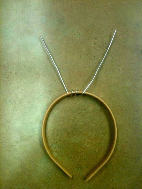 Envuelva el alambre más grueso alrededor de la mitad de la diadema de 14 pulgadas 2 - 3 veces. Así que parece que hay antenas que sobresalen de la diadema. Si le resulta difícil lograr que permanezca en uso un pegote de pegamento para fijarlo, de lo contrario sólo doblar apretadamente como sea posible. Luego doblar los extremos de las "antenas" abajo para crear ganchos pequeños.