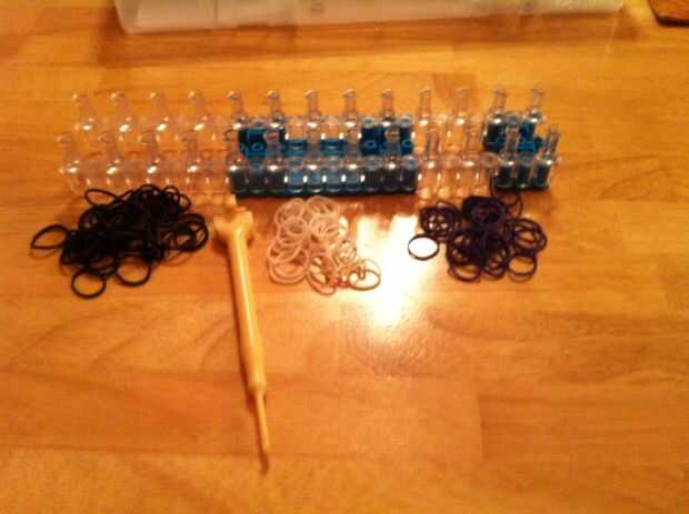 Paso 1: materiales You need :-bandas de caucho-S o C clip-horquilla-lápiz (opcional)Estoy usando púrpura y verdePaso 2: Primer paso Gancho agarrador de la horquilla y su primera banda de goma (el mío es morado) deslícelo a través de la primera cerda,