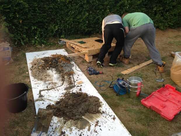 Mezclar el concreto en un 1: relación de 2:4 (1 parte de cemento, 2 partes de arena afilada, totales 4 partes). Usar la espada para poner el hormigón en el molde de madera. Puede usar un bastón largo de madera longitudinalmente para asegurar que el hormigón es plano y tiene el mejor final. Esta capa superior creará el piso del horno de pizza así probar y obtener tan suave como sea posible.
