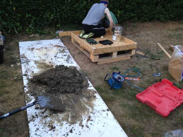 Después de que la plataforma está ordenada, utilice la sierra para madera para cortar una sección de tablero de viruta que se adapta exactamente a la base de la plataforma. Cortar algunas tiras de aglomerado que son alrededor de 50mm de altura para formar un perímetro alrededor de la parte superior de la plataforma. Asegúrese de que hay no hay grandes brechas entre las tablas como esto formará el sello en el hormigón!
