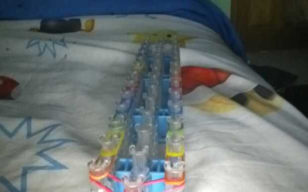 Esta es la pulsera como se verá cuando esté terminado. Yo recomiendo usar 3 colores diferentes para esta pulsera. Antes de poner las bandas en el paso siguiente Asegúrese de que doble todas las bandas, si crees que me refiero a hacer una banda de la