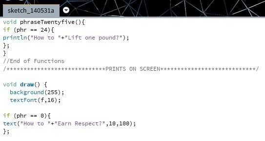 Por lo tanto, en teoría, si nuestro número aleatorio posición generador, el cual fue int phr = int(random(phrase.length)),