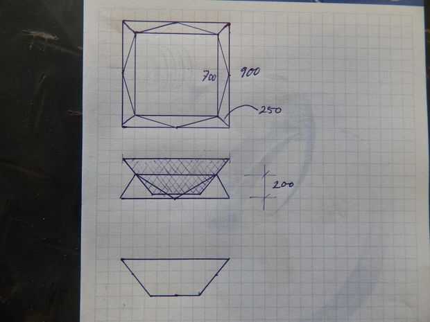 La idea del stand es levantar con seguridad el recipiente por encima del nivel del suelo. Simplemente se compone de dos cuadrados; uno es de 700 mm x 700 mm para la parte del tazón de fuente y la base es 900 mm x 900 mm. entre estas plazas es un enrejado muy simple para darle rigidez.