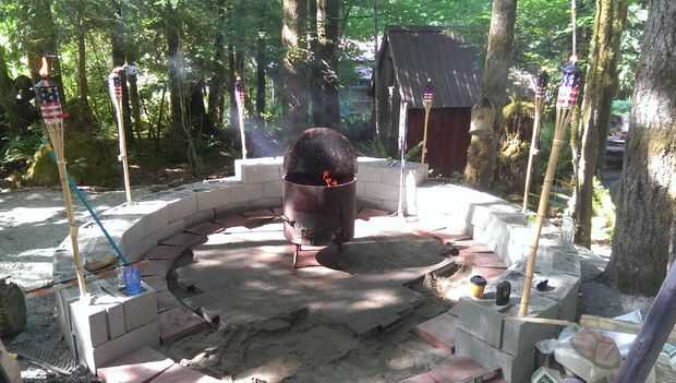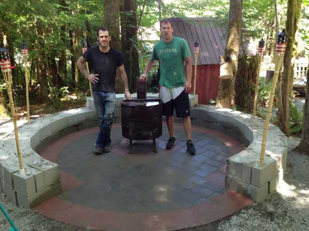 El próximo fin de semana nos pidió prestado un mojado Sierra (no fotos) y corte todas las extrañas forma gris que alrededor del perímetro, junto con todas la cuña en forma de rojo unos en el mismo perímetro. La sierra trabajó fantásticamente pero todavía tomó todo el día para que se vea justo... con pausas para bebidas adultas por supuesto.