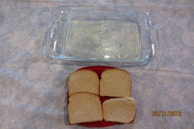 Ahora que ya tenemos la lista de ingredientes para hornear, vamos a empezar por poner el pan en el fondo del plato. Pan hace que los demás ingredientes huevo horneado a pegarse cuando se cocina. Esto permite que el huevo Bake para servirse en porciones sólidas. Los pasos siguientes muestran cómo colocar el pan en el plato de la hornada.