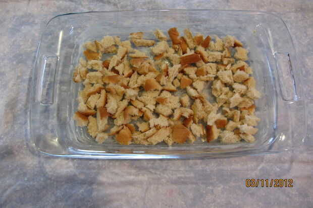 1. Saque las cuatro rebanadas de pan blanco y desmenuzar el pan en el 9 "x 13" hornear.