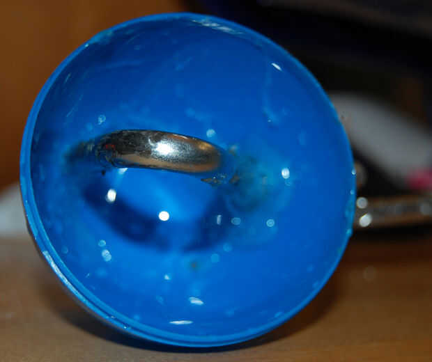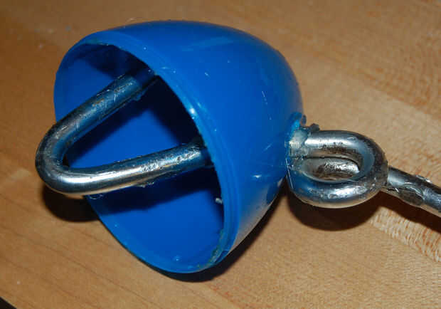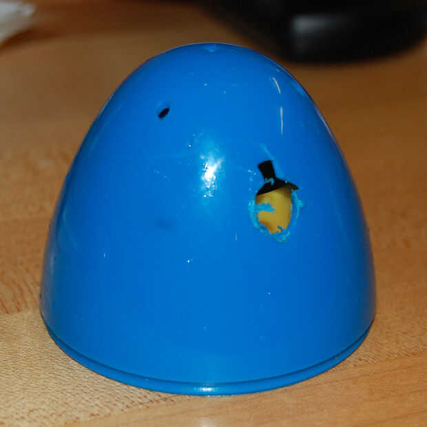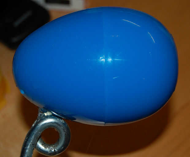 Ahora, perfore un agujero en la parte inferior de una de las mitades de huevo para montar el asa doblado en. Ten cuidado. Roto mi huevo. Si eso ocurre, debe trabajar un parche rápido con pegamento caliente. Además, usé el pegamento caliente para llenar los vacíos alrededor de la estaca y el agujero y rellenar los orificios de ventilación del huevo.