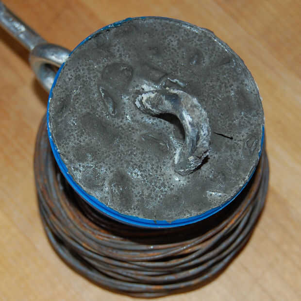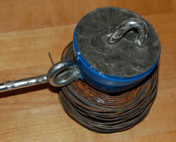 Después del llenado, conjunto el huevo medio lado a endurecerse. Puse mi en un carrete de alambre para mantenerlo equilibrado mientras se secaba. Cuando esté seco, debe tener un buen huevo firme con un lazo de acero sobresale la mitad.