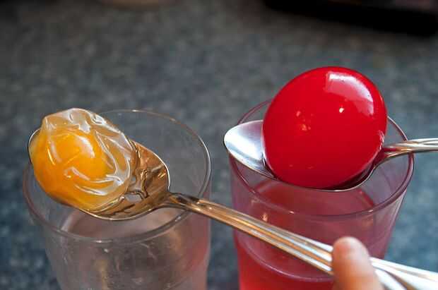 Imagen: A deshidratado desnudo huevo side by side con un rojo brillante huevo desnudo empapado de colorante de alimentos rojo.