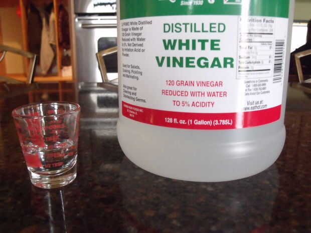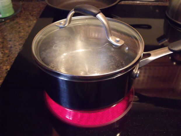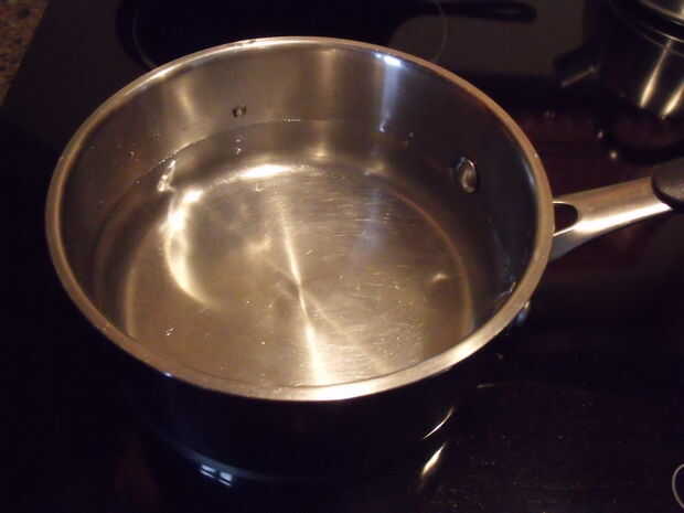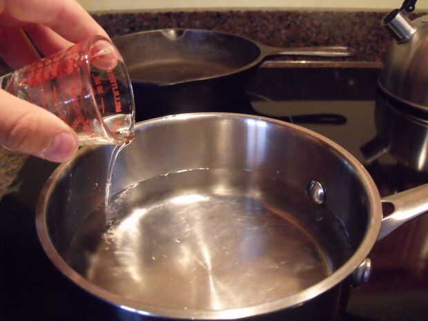 Poner 1 cucharada de vinagre (blanco) en la olla 1/2 lleno de agua y encienda el calor alto.