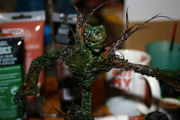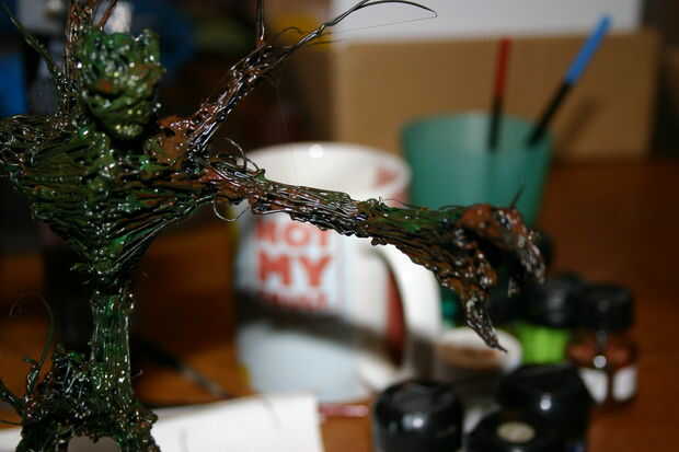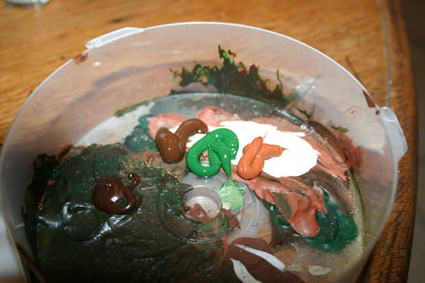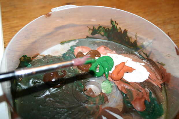 22: usar pintura acrílica basada en agua. Mantenga a los colores naturales de marrones, verdes y caqui. En lugar de mezclarlos, recoger las pinturas en diferentes bordes de la brocha para conseguir una agradable capa base mixta. Usted puede rociar el modelo de lanilla en primer lugar si lo desea.