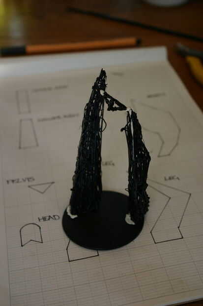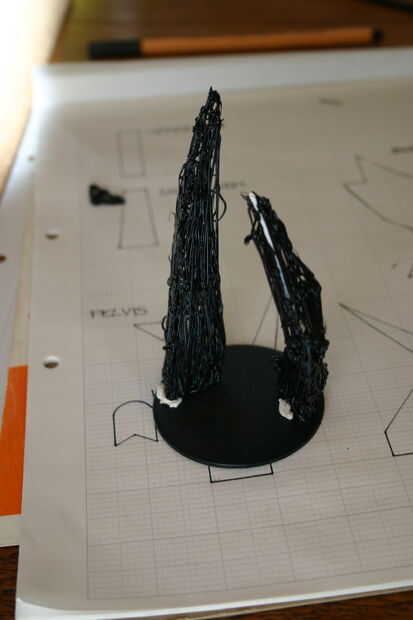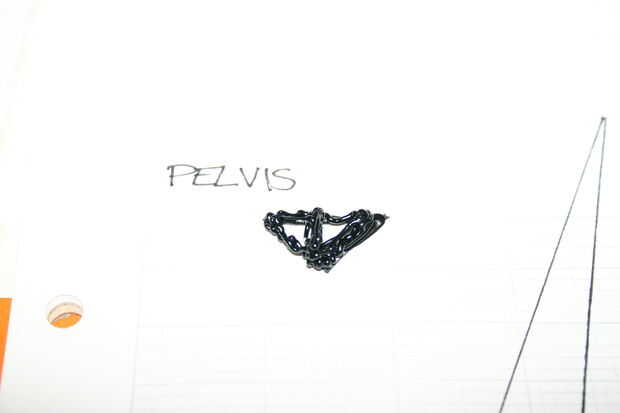 6: con ambas piernas hechos, dibujar el marco de la pelvis. Con Tack, fije temporalmente los pies a la base y la pelvis en la parte superior de las piernas para ver cómo todo encaja.