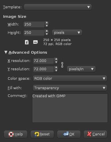1) ir a archivo > nuevo 2) crear la imagen de 250 x 250 y haga clic en opciones avanzadas. Se llenan de menos:, utilice transparencia 3) ahora tendrá una pantalla similar a la siguiente (tercera imagen)