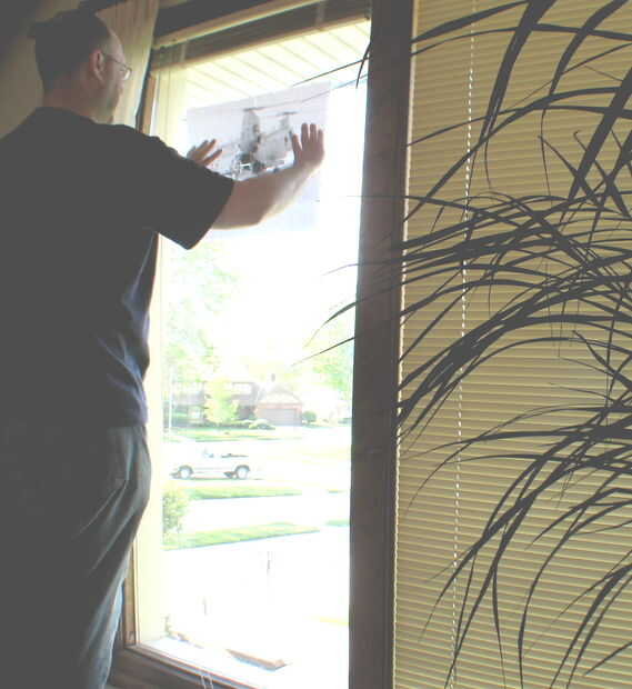 Cinta la cinta cartel a la ventana con su cinta de enmascarar de redacción. Ponerlo en el sobre nivel del ojo, a una altura cómoda para que su brazo no se cansa. No tiene que estar a nivel. Bofetada a ese cachorro allí. Lo que tiene que ser, sin embargo, es plana. Asegúrese de que está adherida con cinta plana como sea posible a la ventana, de lo contrario su hoja de cubierta flotará por encima partes de él, y cuando usted presione hacia abajo como usted traza el maestro puede cambiar.