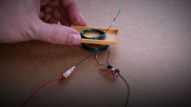 Ahora que la bobina del inductor tiene poder, puede tener la bobina del receptor (con LED) y colocar cerca el la bobina del inductor. Cuanto más cerca obtiene, el más brillante del LED brillará. Usted puede incluso probarlo poniendo papel o plástico entre las dos bobinas y ver cuántos lleva antes de que el LED no se enciende.