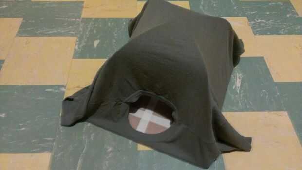 Tire la camiseta sobre el marco. Para hacer una abertura, posición del orificio del cuello hasta que se enfrenta a la parte delantera de la tienda. Luego tire de la camisa para comprobar que la abertura quede apretada.