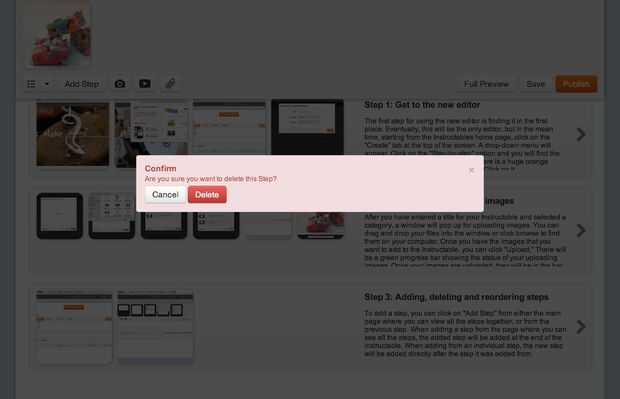 Para borrar un paso, puede ver todos los pasos y pase al cursor sobre la esquina inferior derecha del paso que desea borrar. Aparecerá una "X" roja. Haga clic en la "X" y aparecerá un cuadro de diálogo para confirmar que desea eliminar el paso. Si usted, haga clic en "borrar", si no desea eliminar el paso, haga clic en "Cancelar".