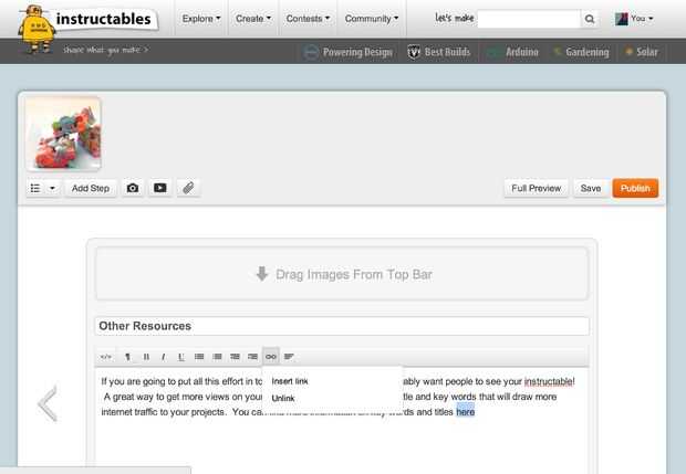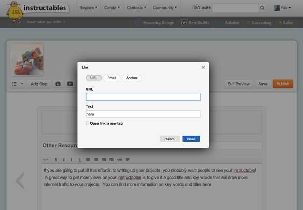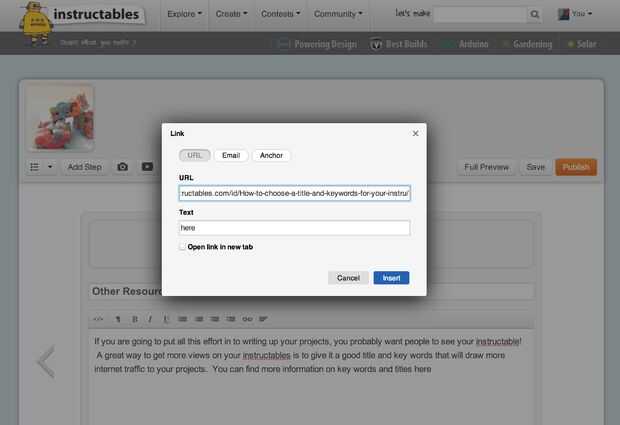 Puede ser extremadamente útil incluir enlaces en tu instructables, o que está enlazando a instructables otros lugares para obtener materiales, incluyendo enlaces es una gran manera de hacer su instructables más legible y pulido aspecto.