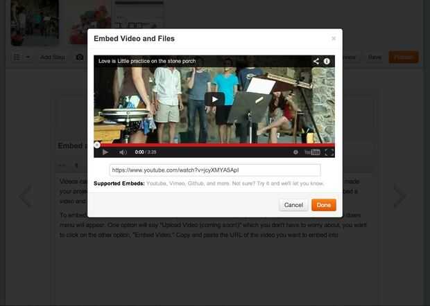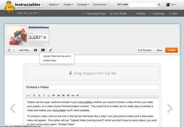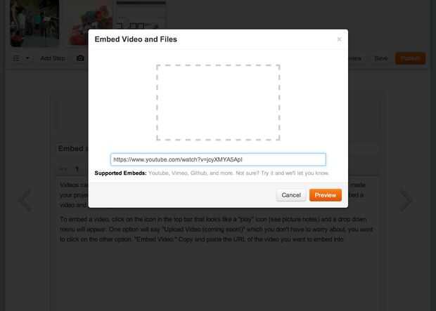 Para incrustar un vídeo, haga clic en el icono en la barra superior que parece un icono de "play" (ver notas de imagen) y aparecerá un menú desplegable. Una opción a decir "Subir Video (¡ próximamente!)" que usted no tiene que preocuparse, que desea haga clic en la opción "Embed Video". Copiar y pegar la URL del vídeo que desea incrustar en el campo de texto y haga clic en "vista previa". Debería aparecer una vista previa de su vídeo. Si es correcto, puedes hacerlo a continuación, haga clic en "Hecho" y su video se incrustará en el instructable.