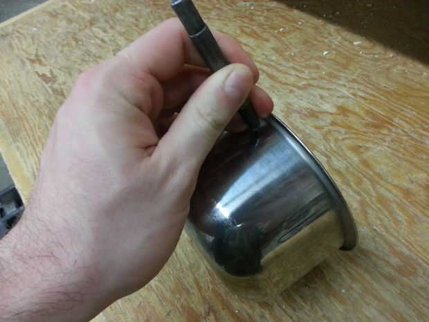 Hacer taladros en cuatro lugares a lo largo de la llanta en ambos recipientes, como se muestra en las fotos