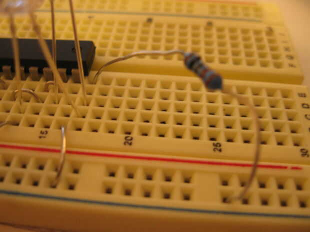Cap de uF 10 que se conecta a la clavija 4 (+) y una fila abierta más cercana a la IC (-).  La resistencia de 2.2 k se conecta a la misma fila de la negativa en el condensador.  Conectar el resistor de 1meg esa misma fila y al pin 1.  Conecte uno de los ánodos LED al pin 4 y el cátodo a una fila libre.  Conectar otros LEDs ánodo a la clavija 5, 3 o 6 y el cátodo a la misma fila como los demás.  Conectar la resistencia de 1 k a esa misma fila y luego a tierra.