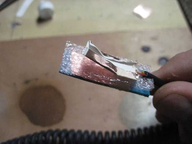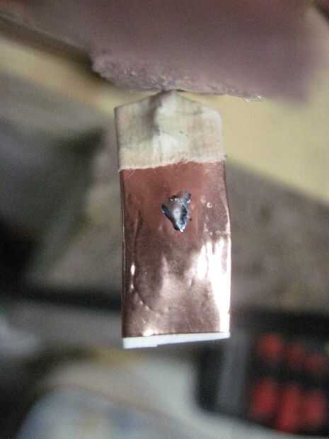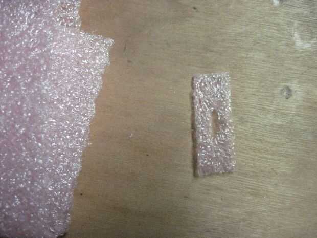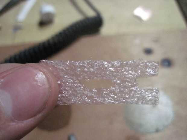 Hacer un pequeño hueco rectangular (o circular) en medio de la espuma para que las placas de cobre se hacen contacto cuando presionados juntos. Conectar el multímetro al otro extremo de la cuerda y la prueba para la conductividad cuando presiona. Puede que necesite poner un cordón de soldadura en una pieza de cinta para ayudar a cerrar la brecha.