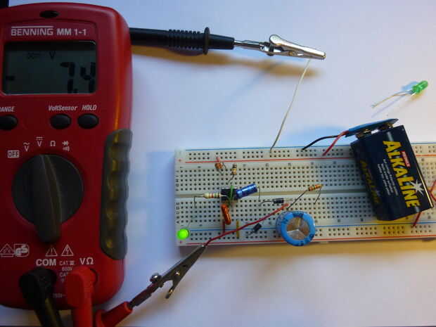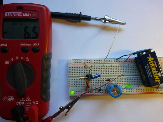 Llegué a abaout 7,4 voltios sin ninguna carga y alrededor de 6,5 voltios con un LED como carga.