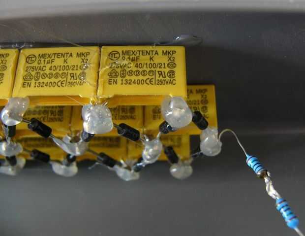 Una vez que los componentes se sueldan puse gotas de pegamento en los filos soldadas para reducir la descarga de corona que mejora el rendimiento de la HV (alto voltaje).