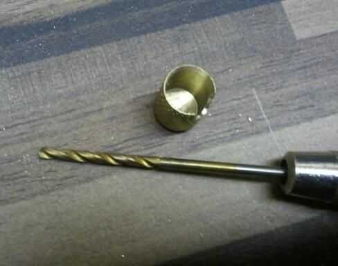 Toma uno y haga un orificio en el extremo. Usé un pin vicio y broca de 2,5 mm hacerlo lentamente con la mano como el cilíndrico es bastante pequeño y delicado. Si taladra desde el interior debe haber una depresión en el centro de fabricación, por lo que no necesitará centro de perforar el agujero primero. Utilizar la herramienta de pulido para agrandar el agujero con el diámetro requerido. Archivo esta la arena suave y pulir.