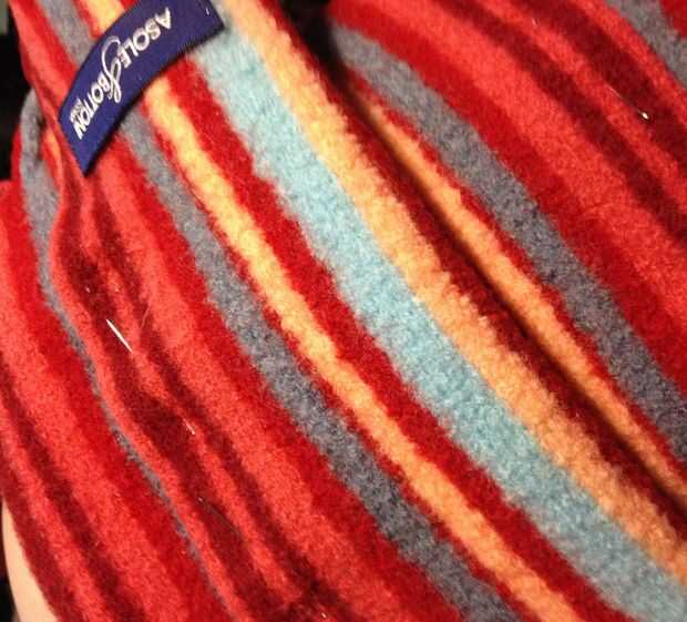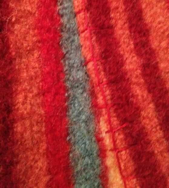 Usé una puntada de manta con hilo rojo en la parte exterior de la costura de la bufanda (lo que sería el lado "derecho" de la bufanda). Este es el lado que va a tocar mi cuello y ropa.